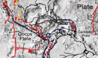 The lithosphere is broken up into about 2 dozen or so plates, which move with respect to one and other. This plate motion, together with the flow of the underlying asthenosphere, is part of a system of convection that is the principal way in which the Earth looses heat. (Part of this heat is produced by decay of radioactive elements within the Earth, the other part is left over from formation of the Earth, 4.5 billion years ago.) Mid-oceans ridges are located at the edges of plates moving away from one and other. One such mid-ocean ridge, the Galapagos Spreading Center, is located just north of the Galapagos archipelago. Mid-ocean ridges are often offset by fracture zones or transform faults. A major transform fault is located just north of the Galapagos at 91 W. Subduction zones occur where plates collide. A major subduction zone is located along the west coast of Central and South America, where the Nazca and Cocos Plates are subducting beneath the South American and Carribean plates. Subduction zones are marked by deep trenches and overlying chains of volcanoes (the Andes, for example).